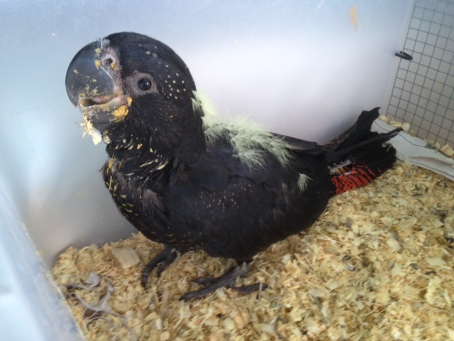 Baby WA subspecies Red tailed black cockatoo very tame loves cuddles, nearly weaned - now SOLD.